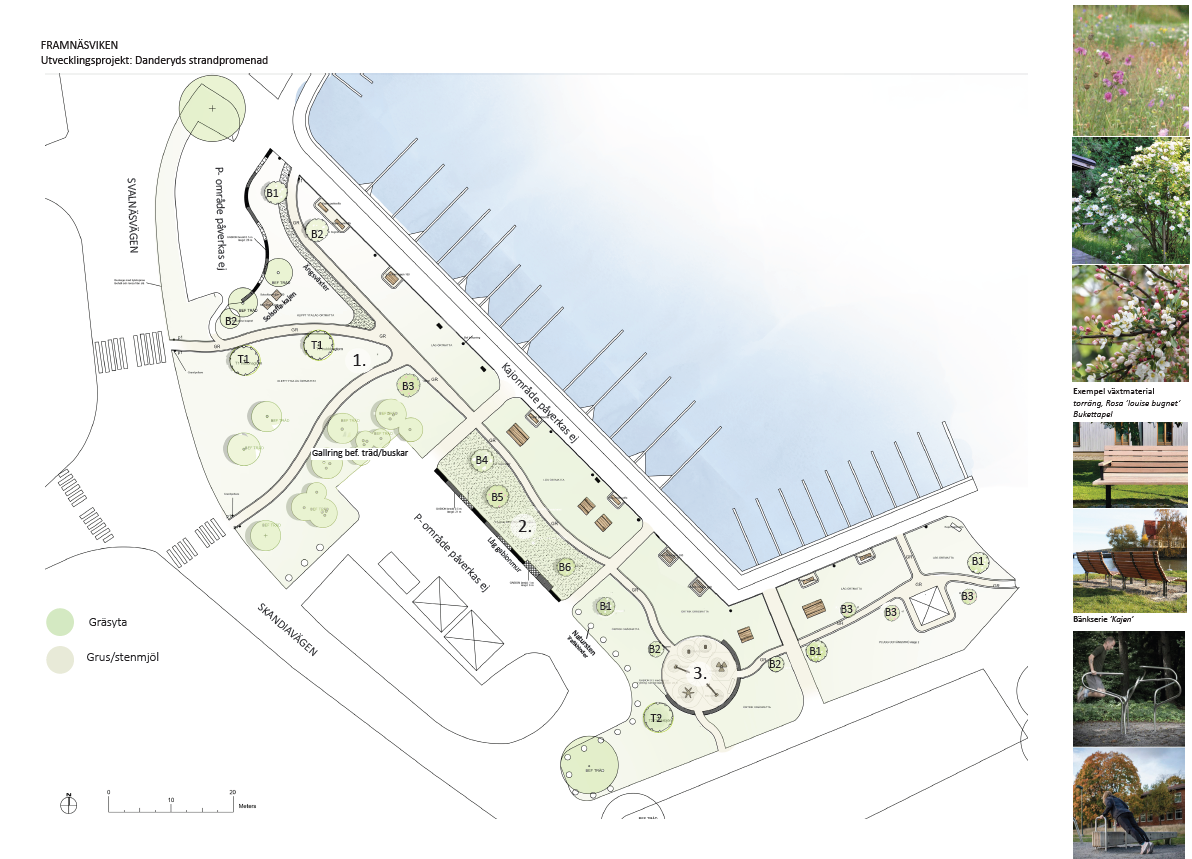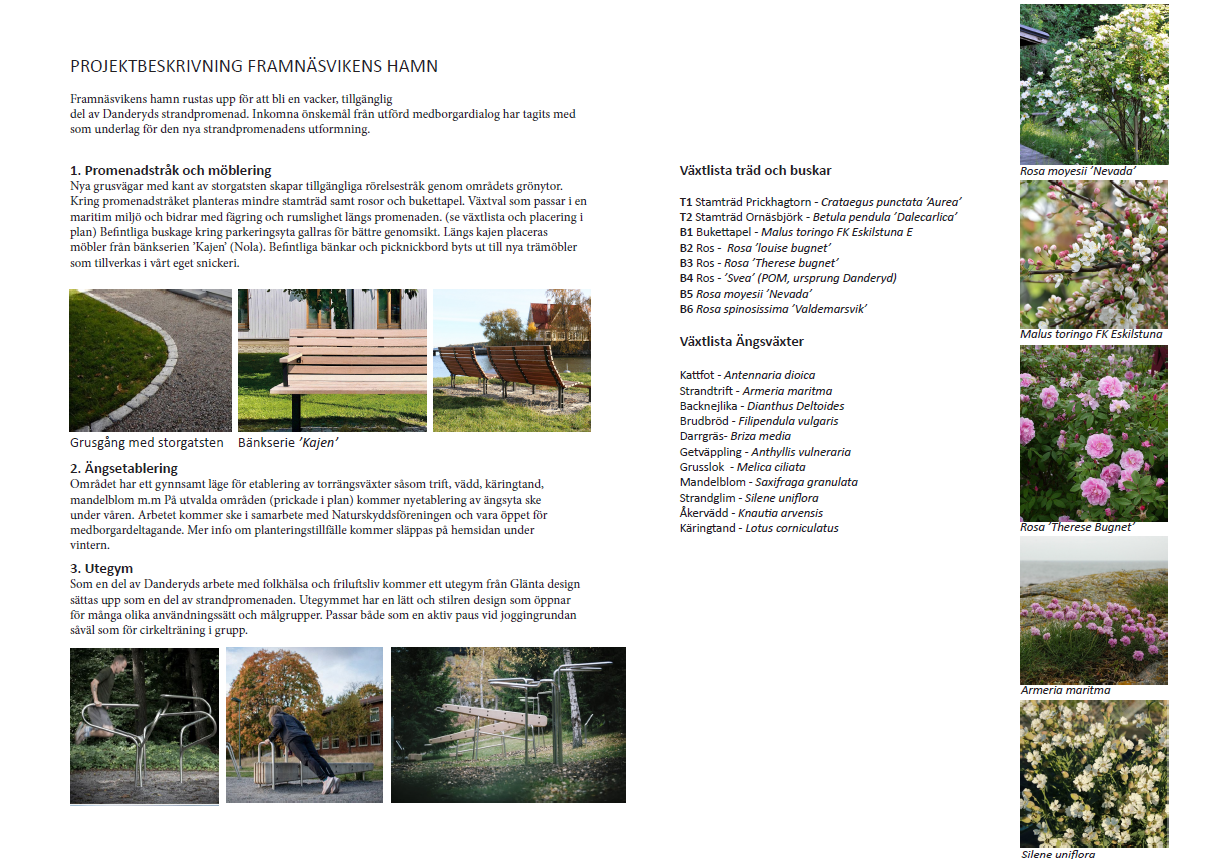 Nya grusvägar med kant av storgatsten skapar tillgängliga rörelsestråk genom områdets grönytor. Kring promenadstråket planteras mindre stamträd samt rosor och bukettapel. Växtval som passar i en maritim miljö och bidrar med fägring och rumslighet längs promenaden (se växtlista och placering i pdf ovan). Befintliga buskage kring parkeringsyta gallras för bättre genomsikt. Längs kajen placeras möbler från bänkserien ’Kajen’ (Nola). Befintliga bänkar och picknickbord byts ut till nya trämöbler som tillverkas i vår entreprenörs eget snickeri.