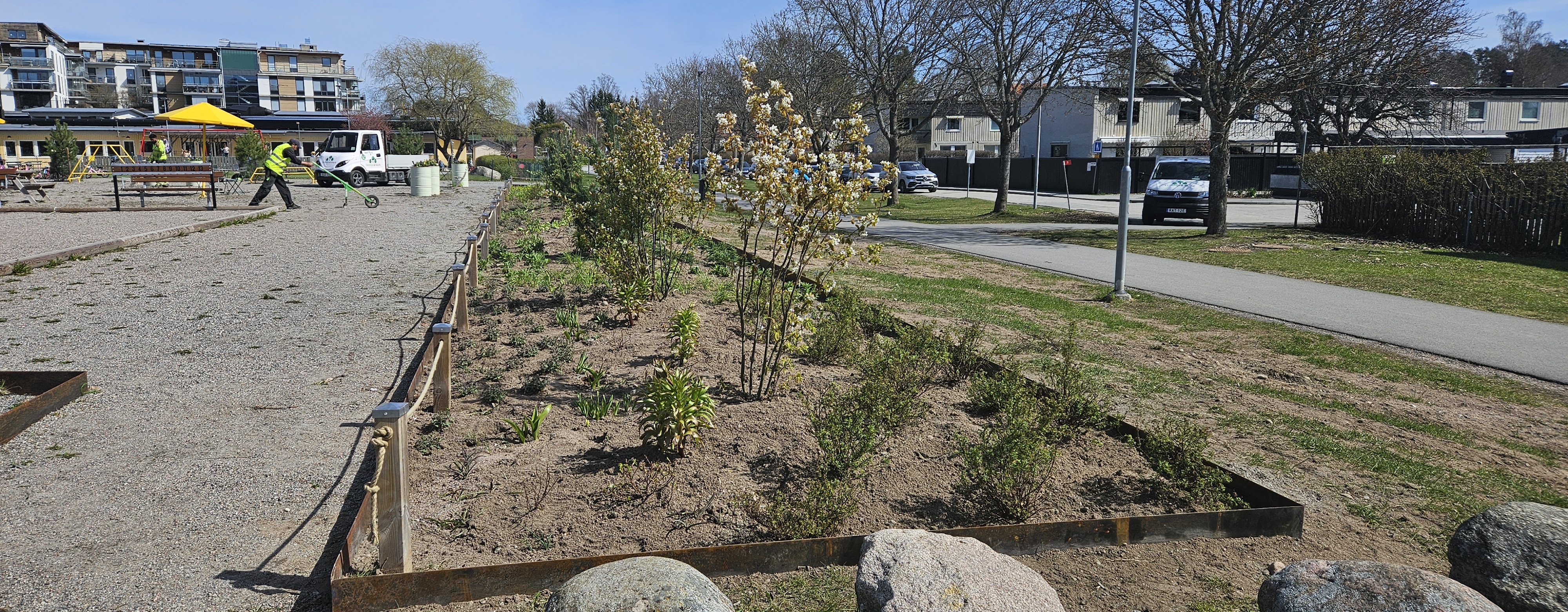 Bouleparken ska bli ännu vackrare och trivsammare att vara i. Under våren 2024 får Bouleparken en ny inramning i form av stora planteringar med träd, buskar och perenner. För att utöka blomningen och skapa dynamik i planteringen har vi även satt lök som blommar från tidig vår och in på sommaren när perenner och buskar tar vid. Exempel på blommande träd och buskar är röd och rosa ölandstok, kopparhäggmispel och prydnadsapel. För att ge planteringen struktur även under vinterhalvåret har det planterats städsegröna växter så som tall och en som även förekommer naturligt i omgivningarna.