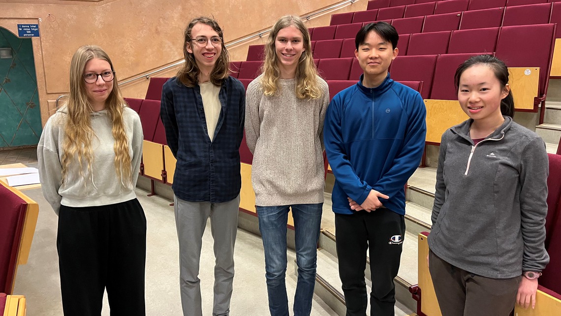 Från vänster: Karin Faxén (N23a), Svante Brohagen (N23a), Aron Helzel Golan (N23a), Ruibin Wang (N25a), Leshi (Lucy) Zhang (N24a)